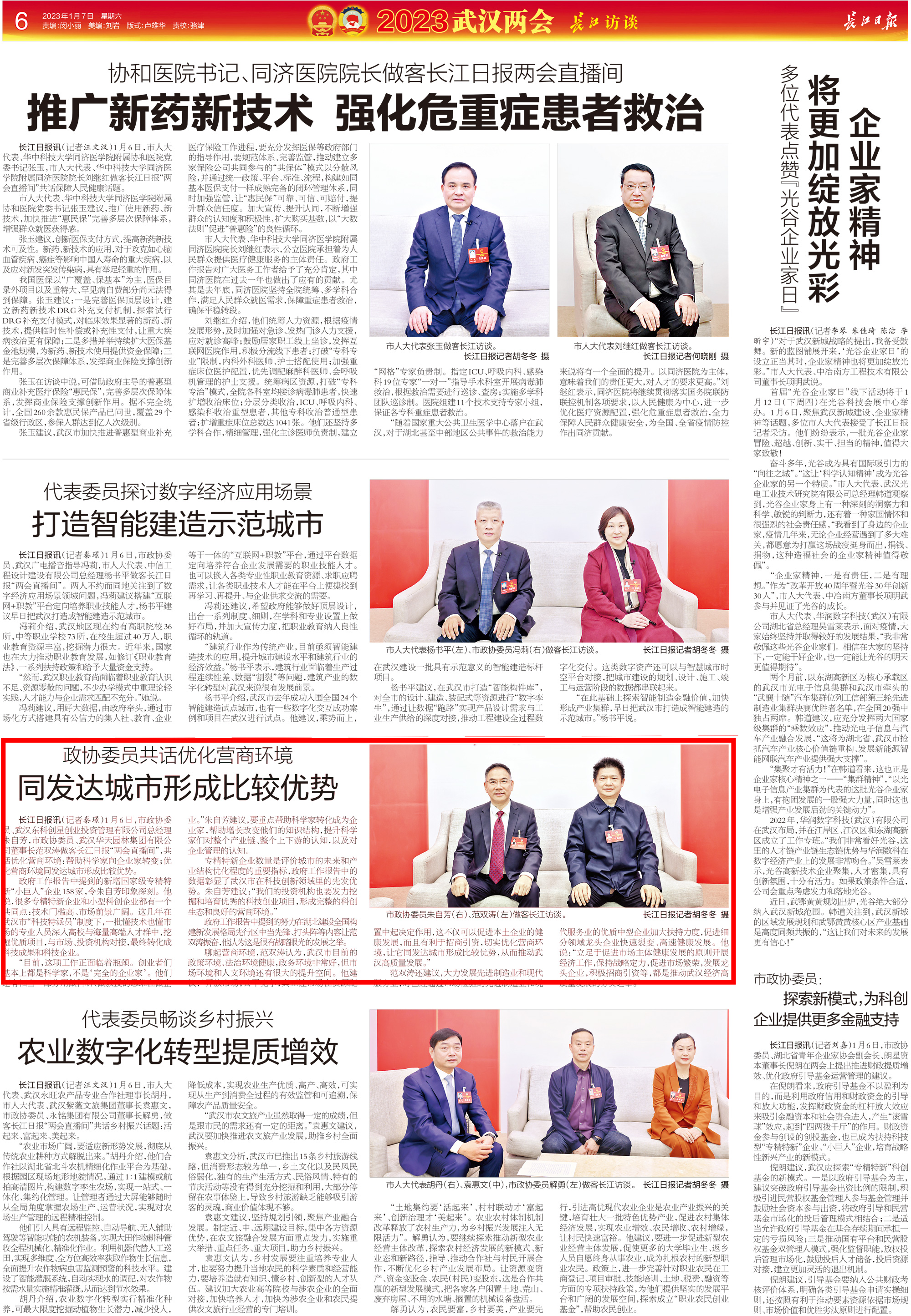1月7日,長江日報刊發(fā)2023兩會專版,范董事長提出的“優(yōu)化營商環(huán)境同發(fā)達城市形成比較優(yōu)勢”的建議被收錄其中。針對武漢市政府工作報告提出的“高標準啟動武漢新城建設,打造武漢都市圈高質量發(fā)展和區(qū)域協同發(fā)展主引擎”,范董事長對武漢新城定位中國的“國際交往中心”、“中國式現代化宜居濕地城市樣板”提法感到振奮建議,他說,“未來要以武漢新城為中心構建軌道交通、快速道路等重要交通系統,規(guī)劃里提到在武黃高速南側設武漢新城站,天南海北客商來此地,第一眼或許就是‘武漢新城’這張新武漢名片。”他建議武漢新城所涉區(qū)域應大做“水文章”,營造產城融合和人與自然和諧共生的城市格局。同時他也表示,武漢華天園林在武漢都市圈承擔多個水體修復、濱水景觀工程,愿在以武鄂黃黃為核心的武漢都市圈建設中貢獻力量。